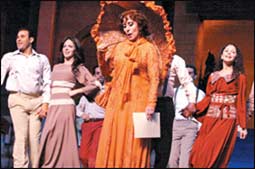 المطربة اللبنانية فيروز تؤدي وصلة غنائية من مسرحية موسيقية في قاعة (بي آي إي إل) في بيروت بعد أن تم تأجيلها بسبب العدوان الإسرائيلي، والمسرحية بمناسبة ذكرى خمسين عاماً على مهرجان بعلبك الدولي .*ا.ف.ب