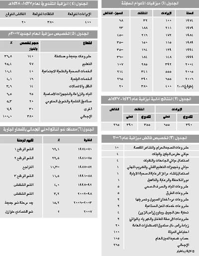 د. حسن الشقطي(*) تم الإعلان أمس الأول عن النتائج المالية لميزانية عام 2006م، والموازنة التقديرية للعام الجديد 2007م، وقد انطوى الإعلان عن أرقام وتقديرات تشير إلى نتائج غير مسبوقة في التاريخ الاقتصادي للمملكة، لدرجة أنها تجاوزت حدود أرقام الطفرة الاقتصادية الأولى، وسنتناول واقع الاقتصاد الوطني في ضوء الميزانية الجديدة. كما هو موضح بالجدول رقم (1) نتائج غير مسبوقة من قبل... بنظرة قصيرة إلى ميزانيات الاقتصاد الوطني منذ بداية مراحل نموه الأولى (منذ عام 1974م)، يتضح أن ميزانية العام المنصرف 2006م هي الميزانية الأعلى في تاريخ المملكة سواء في حجم الإنفاق أو حتى في مستوى الإيرادات. فمستوى الإيرادات فاق كل التوقعات نتيجة لعاملين، هما استمرار نمو الاقتصاد الوطني والطلب على النفط الخام. كما هو موضح بالجدول رقم (2) نجاح تخطيطي في تحفظ الإيرادات إن مفهوم ميزانية أو موازنة هي بمثابة بيان تقديري لمستويات الإيرادات والنفقات لعام قادم، وهذه المستويات قد تتغير بالزيادة أو النقص في ضوء الواقع الفعلي في المستقبل. وهنا يظهر مدى دور التخطيط الجيد وأهميته في توقع هذه المستويات وتقديرها. وقد نجحت سياسة الحذر التخطيطي التي تتبناها وزارة المالية منذ سنوات ماضية في إعفاء الاقتصاد الوطني من ويلات الإسراف والمبالغة في حجم الإيرادات. فمن خلال استقراء الجدول (2) يتضح أن الرقم الذي تم تقديره للإيرادات في بداية عام 2006م كان 390 مليار ريال، في حين أن الإيرادات الفعلية بلغت 655 مليار ريال، وهو أمر ينبغي الإشادة به في بناء الميزانيات التقديرية مع افتراض أسوأ الظروف وليس العكس. بل إن المفلت للنظر أن تقديراتها للنفقات جاءت قريبة نسبياً من مستوى النفقات الفعلية. تخصيص فائض ميزانية عام 2006م لتعزيز عمليات التنمية... في ظل الزيادة الكبيرة في حجم الإيرادات الفعلية لعام 2006م، فقد تولد فائض هو الأعلى في تاريخ ميزانيات المملكة بنحو 265 مليار ريال. تم توجيه هذا الفائض لتمويل مشروعات المرحلة الثالثة من البرنامج الإضافي لتطوير الخدمات وتحسينها وتعزيز التنمية على مدى خمسة أعوام مالية ابتداءً من العام المالي القادم 1427 - 1428هـ. كما هو موضح بالجدول رقم (2) ولكن من الملفت للنظر تخصيص رقم مهم بلغ 205 مليارات لتسديد الدين العام واحتياطي الدولة. ميزانية العام الجديد 2007م تستهدف الاستقرار.. لقد تم الإعلان عن موازنة العام الجديد 2007م بناء على تقدير مستوى إيرادات بنحو 400 مليار، ومستوى نفقات بنحو 380 مليار. وهو مستوى يفوق الموازنة التقديرية للعام الماضي التي قدرت الإيرادات بـ 390 ملياراً والنفقات بنحو 355 ملياراً. بل إن مستويات الميزانية التقديرية للعام الجديد تكاد تقترب كثيراً من الميزانية المقدرة للعام السابق. وجدير بالملاحظة أن ميزانية العام السابق تم بناؤها أساساً لإحراز هدف السياسة التوسعية التي بدأتها الحكومة منذ عام 2004م تقريباً بضخ مستويات إنفاق مرتفعة لحقن الاقتصاد بجرعات قوية من التوسع والانتعاش. كما هو موضح بالجدول رقم (4) ومن الواضح أن السياسة التوسعية قد أحرزت نتائجها بشكل أكبر من المتوقع في ظل الطفرة الكبيرة التي طرأت في الطلب على النفط في السوق العالمية. ومن ثم إتاحة مستوى ضخم من الإيرادات لميزانيات الأعوام 2005م و2006م. الأمر الذي مكن من تلبية كل أوجه الصرف والإنفاق سواء للمشروعات التنموية أو تحسين الخدمات واستكمالها والبنية التحتية في الاقتصاد الوطني. بالتحديد، فإن كل أوجه الإنفاق في النهاية تصب في بوتقة تعزيز حركة الاقتصاد الوطني وتعزيز أوجه النشاط الاقتصادي بمختلف أشكالها. فعلى سبيل المثال، قد يرى بعضهم أن مشروع إنشاء دور تأهيل المعاقين ومراكزهم هو مشروع سيخدم فئات المعاقين فقط، إلا أن هذا التصور قاصر لأنه إنفاق مليار ريال على مثل هذا المشروع في حقيقته يحرك عدداً من أوجه النشاط الاقتصادي من خلال التشابكات الأمامية والخلفية، فقطاع المقاولات وقطاع الكهرباء والاتصالات والعقارات والأسمنت والخزف والزجاج والحديد والت