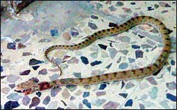* القريات - سلامة الحريّص: أثارت أفعى سامة الرعب في نفوس معلمات وطالبات الابتدائية الثانية والعشرين للبنات بالقريات (مبنى مستأجر) صباح يوم أمس الأول الاثنين، وكانت قد تسللت الأفعى إلى داخل المدرسة، وعند حضور المعلمات في الصباح تعالى الصراخ وصيحات النجدة من المعلمات والطالبات على حد سواء؛ مما استدعى الأمر بإحدى المعلمات إلى طلب النجدة من سائقها الخاص، وعلى الفور تم إخلاء المكان الذي تحتاط به الأفعى من أجل دخول السائق الذي توجه نحو الأفعى واستطاع قتلها والخلاص من خطرها الذي سبَّب الذعر لدى الجميع، وقد بلغ طولها التقريبي نحو المتر ونصف المتر، ليعود الهدوء بعدها داخل المدرسة ومن ثم استكمال اليوم الدراسي بعد لحظات من القلق والخوف.