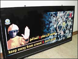* المشاعر المقدسة - إبراهيم بكري: يستعين الدفاع المدني بالحج لأول مرة بشاشة إلكترونية تم تجهيزها بالصين تسمى (الإضاءة الباردة) انضمت إلى قافلة التوعية والإرشاد في الحج، وهي عبارة عن 20 لوحة إرشادية تتسم بخفة الوزن طولها متران وعرضها متر واحد وسماكتها لا تتجاوز ثلاثة مليمترات، ولهذا يسهل