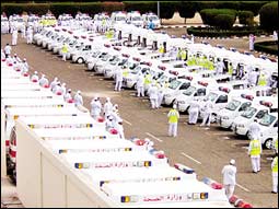 * منى - أحمد القرني: انطلقت في أول يوم من أيام التروية الثامن من ذي الحجة لهذا العام 1427هـ (65) سيارة من سيارات الإسعاف الصغيرة العاملة ضمن لجنة الطوارئ والطب الميداني لتصحب الحجيج في أماكن وجودهم بمنى حيث تنشر في كافة أرجاء منى في يوم التروية لتؤدي واجبها في علاج الحالات الطارئة والاسعافية
