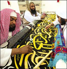 * مكة المكرمة - عمار الجبيري: تمَّ يوم أمس الجمعة استبدال كسوة الكعبة المشرفة الحالية بالكسوة الجديدة - جرياً على العادة السنوية - والتي تمت صناعتها بمصنع كسوة الكعبة المشرفة بحضور عدد من منسوبي الرئاسة العامة لشؤون المسجد الحرام والمسجد النبوي الشريف ومن مصنع كسوة الكعبة المشرفة. يُذكر أن التكلفة الإجمالية لثوب الكعبة المشرفة تبلغ 20 مليون ريال وتصنع من الحرير الطبيعي الخاص الذي تم صبغه باللون الأسود، ويبلغ ارتفاع الثوب 14 متراً ويُوجد في الثلث الأعلى منه الحزام الذي يبلغ عرضه 95 سنتمتراً وبطول 47 متراً والمكون من ست عشرة قطعة محاطة بشكل مربع من الزخارف الإسلامية. كما تُوجد تحت الحزام آيات قرآنية مكتوب كل منها داخل إطار منفصل ويوجد في الفواصل التي بينها بشكل قنديل مكتوب عليه (يا حي يا قيوم) (يا رحمن يا رحيم) (الحمد لله رب العالمين) ومطرز الحزام بتطريز بارز مغطى بسلك فضي مطلي بالذهب ويحيط بالكعبة المشرفة بكاملها. وتشتمل الكسوة على ستارة باب الكعبة ويطلق عليها البرقع وهي معمولة من الحرير بارتفاع ستة أمتار ونصف المتر، وبعرض ثلاثة أمتار ونصف المتر مكتوب عليها آيات قرآنية ومزخرفة بزخارف إسلامية مطرزة تطريزاً بارزاً مغطى بأسلاك الفضة المطلية بالذهب. وتتكون الكسوة من خمس قطع تغطي كل قطعة وجهاً من أوجه الكعبة المشرفة والقطعة الخامسة هي الستارة التي تُوضع على باب الكعبة ويتم توصيل هذه القطع مع بعضها البعض. وتمر صناعة الكسوة بعدة مراحل هي (مرحلة الصباغة) التي يتم فيها صباغة الحرير الخام المستورد على هيئة شلل باللون الأسود أو الأحمر أو الأخضر ومرحلة النسيج ويتم فيها تحويل هذا الشلل المصبوغة إما إلى قماش حرير سادة ليطبع ثم يطرز عليه الحزام أو الستارة أو إلى قماش حرير جاكارد المكون لقماش الكسوة (ومرحلة الطباعة) ويتم فيها طباعة جميع الخطوط والزخارف الموجودة بالحزام أو الستارة على القماش بطريقة السلك سكرين وذلك تمهيداً لتطريزها (ومرحلة التجميع) ويتم فيها تجميع قماش الجاكارد لتشكل جوانب الكسوة الأربعة ثم تثبت عليه قطع الحزام والستارة تمهيدا لتركيبها فوق الكعبة المشرفة. وتتم هذه المراحل في جميع أقسام المصنع المتمثلة في أقسام الحزام والنسيج اليدوي والنسيج الآلي والطباعة والإعلام والستارة والصباغة ويعمل بها أكثر من مائتي موظف من الكوادر السعودية المؤهلة والمدربة على هذه الصناعة المميزة. وينتج المصنع الكسوة الخارجية والداخلية للكعبة المشرفة بالإضافة إلى الأعلام والقطع التي تقوم الدولة بإهدائها لكبار الشخصيات.