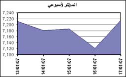 لقد افتتح السوق هذا الأسبوع على هبوط كبير استمر يومين هبط فيهما المؤشر بنسبة 5.02%، حيث أغلق يوم الأحد عند 7181 نقطة، تلاه صعود بنسبة 0.08%، ثم انكسر مرة ثانية يوم الثلاثاء ليحرز خسارة بنحو 0.91%، وأخيراً يحقق المؤشر ربحاً بنحو 96.3 نقطة أي بنسبة 1.35%. وبإغلاق المؤشر هذا الأسبوع عند 7215.6 نقطة يكون قد ربح نحو 344 نقطة أي ما يعادل 4.6%.