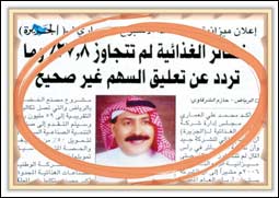 أعلنت شركة المنتجات الغذائية أن ما نشر مؤخراً بأنها من بين الشركات المهددة بالتعليق بعد أن تجاوزت نسبة خسائرها مع نهاية الربع الثالث أكثر من 50% غير صحيح. وأوضحت أن المحلل المالي لم يطلع على البيانات المالية للربع الثالث المنشورة على موقع تداول في حينه وقد جانبه الصواب في تحليله. حيث إن خسائر الشركة في الربع الثالث لم تتجاوز نسبة ( 27.8% ) من رأس مال الشركة وذلك كما انفردت (الجزيرة) أمس.