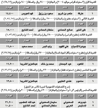 هذا وقد حقق المركز الأول في الشوط الرئيس (نجم وعد) لمالكه غنيم بن رجاء السعدوني من ميدان المجمعة بزمن قدره (2.24.55) وبقيادة الخيال عبد الله العضيب وجاء ثانياً المستبحر لاسطبل العربي من ميدان الجنادرية ليتأهلا للشوط السادس كسفراء للميدان في التصفيات النهائية التي ستقام بجدة، أما الشوط الأول فقد فازت به الفرس (عارفة) لمالكها متعب بن شريم من ميدان الجنادرية كما حلق عالياً (طير الخير) لأبناء علي وعبدالعزيز الحمادي من الجنادرية ليفوز بالشوط الثاني، كما لمعت (جوهرة الأسياح) لعلي الفهيد وفازت بالشوط الثالث, هذا وقد استطاع الجواد البطل (الماهود) لعيد الجمعان من بريده أن يفوز بالرابع بعد منافسة مثيرة، ومثل ميدان الزلفي الجواد (ساحوم) لهندي العتيبي حيث كسب الشوط الخامس بجدارة وقد تخلل الحفل توزيع الدروع للملاك والمدربين والخيالة الفائزين بالأشواط ودروع تكريمية لأعضاء لجنة عز الخيل من إدارة الميدان تفضل بتقديمها الأستاذ محمد البدر مدير عام الميدان والأستاذ صالح الحمادي كما قام سعادة رئيس بلدية محافظة الزلفي المهندس عبدالمنعم بن محمود الراشد بتسليم درع البطولة للسعدوني والعضيب، كما تم تقديم جوائز للجمهور، وقد جاءت نتيجة بقية الأشواط كالآتي: