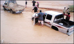 حاول عدد من المتنزهين بوادي الحفنة الذي يغذي الخرارة بالمياه الهرب من مجرى السيول التي دهمتهم خلال جريان الوادي يوم أمس الأول على غير العادة، إلا أن قوة جريان الوادي احتجزت عدداً من السيارات حيث هرع الشباب لمساندة المحتجزين.