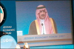 وأضاف الأمير عبد المجيد في كلمته التي ألقاها نيابةً عنه نجله الأمير فيصل في افتتاح منتدى جدة الاقتصادي الثامن الذي افتتح مساء أمس الأول وسط حضور 2000 مشارك ومشاركة من كافة أنحاء العالم أن المنتدى أصبح علامة مضيئة في تاريخ المملكة ومحافظة جدة على وجه الخصوص. وأعرب عن تطلُّعه إلى نجاح منتدى جدة 2007م المقام تحت شعار (الإصلاح الاقتصادي: أرض واعدة، وآفاق ممتدة)، لتستمر نجاحات المنتدى ويستكمل مسيرته المباركة.