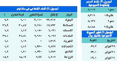 خسر سوق الأسهم هذا الأسبوع نحو 69 نقطة، أي ما يعادل 0.83%، وهي خسارة تأتي في ظل أزمة الهبوط التي سادت البورصات العالمية. وبعيداً عن هذه الأزمة التي أصابت أسواق المال العالمية، فقد استمر المؤشر في موجته الصاعدة خلال يومي السبت والأحد حيث صعد بنحو 1.46% و0.24% على التوالي. ثم تراجع بنسبة طفيفة بنحو 0.35%، ثم تراجع خلال يومي الأزمة العالمية بنحو 0.51% يوم الثلاثاء، و1.65% يوم الأربعاء. وقد أغلق المؤشر عند 8176 نقطة، وهو مستوى لا يزال يعتبر جيداً مقارنة بمستوى قاعه القريب عند 6767 نقطة.