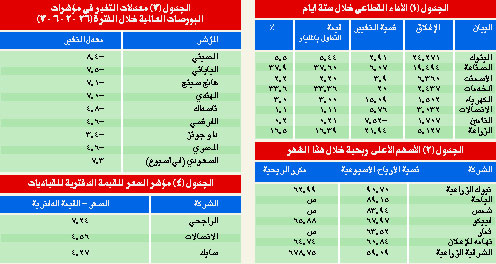 1- صعود القطاع الزراعي بنسبة 44% خلال شهر واحد، وصعوده بنسبة 70.4% خلال 3 شهور. فما الذي حققه القطاع الزراعي أو حققته أسهمه بشركاتها لكي تربح أعلى من 70%، بالطبع لا شي ولا ارتباط بأداء القطاع الذي معظم أسهمه تنتمي لشركات خاسرة.