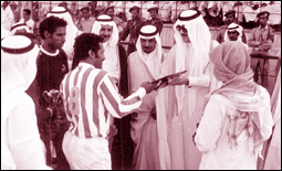 صورة نادرة لصاحب السمو الملكي الأمير فيصل بن فهد إبان رعايته - رحمه الله - حفل الاعتزال الذي نظمته إدارة الهلال للنجم الكبير مبارك العبد الكريم عام 1393هـ في ملعب الصائغ ويظهر في الصورة الأسطورة الهلالية بالثمانينات الهجرية يتسلّم من الأمير الراحل درعاً تذكارياً.. وإلى جانبه معالي الشيخ فيصل الشهيل رئيس النادي آنذاك.