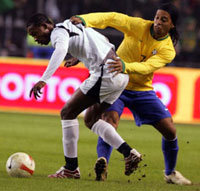 وسجل فاجنر لاف هدف الفوز للبرازيل في الدقيقة 17 من المباراة التي تعد تكرارا لمواجهة الفريقين في الدور الثاني لنهائيات كأس العالم العام الماضي التي انتهت بفوز منتخب البرازيل 3-صفر. وفرض سيزار نفسه نجما للمنتخب البرازيلي بتصديه لأول فرصة خطيرة في الدقيقة 15 عندما ابعد كرة سددها ايريك ادو برأسه وهو على مسافة خطوات من المرمى. وبعد دقيقتين حول كاكا برأسه كرة من ركلة ركنية وصلت إلى لاف غير المراقب الذي اودعها الشباك محرزا ثاني اهدافه الدولية مع منتخب البرازيل. وعاد سيزار إلى الواجهة من جديد في الدقيقة 20 حين تصدى لهجمة خطيرة من اليكس تاشي مينساه. ورغم غياب ستيفان ابيا قائد الفريق ولاعب خط الوسط مايكل ايسين واصلت غانا تهديد المرمى البرازيلي في المباراة التي جاءت بطيئة على نحو غير متوقع. وتألق سيزار مجددا في ابعاد أخطر كرة لمنتخب النجوم السوداء عندما تصدى لتسديدة قوية للاعب لاريا كينجستون من على حافة منطقة الجزاء في الدقيقة 50 قبل ان يبعد كرة أخرى سددها سولي مونتاري من ركلة حرة من 30 مترا. واصطدمت كرة مونتاري بالعارضة قبل تخرج من الملعب. وهددت البرازيل التي سحقت شيلي 4-صفر في جوتنبرج يوم السبت الماضي مرمى غانا في الدقيقة 65 لكن كاكا اضاع الفرصة بتسديده الكرة إلى خارج الملعب. وطرد لاعب خط وسط غانا هامينو دراماني عقب تلقيه الانذار الثاني في الدقيقة 77 ولم تشهد الدقائق الأخيرة خطورة على المرميين وتراجع البرازيليون للوراء للحفاظ على تقدمهم.