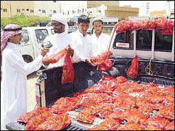 (الجزيرة): التقت مع أحد البائعين في السوق رابح ضويحي الذي أوضح أنه يقوم بجمع هذا الجراد من مكان يُقال له الصغيرة حيث يسهل جمعه وعن أنواع الجراد أوضح الشعراء ويتم جمعه ليلاً وفي أكياس كبيرة حيث يكون موجوداً فوق الأشجار الشاب (رابح) يؤكد أن الجراد نوعان الجراد الدموني وهذا لونه بني ويتميز خلال شويه (طبخه) يخرج منه كمية كبيرة من الدهون أما الجراد الثاني فهو الزعيري ويتميز بصغر حجمه من النوع الأول ويميل إلى اللون الأصفر إذ تبيض الجرادة كميات كبيرة من البيض وتغرسه في تحت الأرض ومنه يبقى لسنوات عديدة أم أسعار الجراد اليوم تختلف بحسب حجم الكيس فمنه بخمسين ريالاً إلى مائتي ريال.