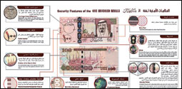 وأيضاً فقد تضمن الإصدار صوراً مائية لخادم الحرمين الشريفين تظهر عند تعرض الورقة للضوء المرسل وعلى أشكال زخرفية تظهر بألوان فسفورية تظهر عند تعريض الورقه للأشعة فوق البنفسجية، وأيضاً على شريط معدني وخيط أمان متغيّر اللون يظهر على ظهر الورقة بشكل متقطع.