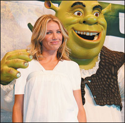 الممثلة كاميرون دياز تقف في مؤتمرها الصحفي أمام مجسم لشخصية شريك الذي تشاركه البطوله في جزئه الثالث. *رويترز