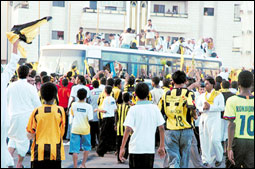 وصلت بعثة الفريق الاتحادي الأول لكرة القدم عند الساعة الخامسة من عصر يوم السبت على متن طائرة خاصة إلى صالة عرابسكو بمطار الملك عبد العزيز بجدة وكان في استقبال أبطال كأس دوري خادم الحرمين الشريفين رئيس هيئة أعضاء شرف نادي الاتحاد المهندس حسن جمجوم، فيما تواجدت أعداد كبيرة من الجماهير الاتحادية على جنبات الطريق المؤدي إلى شارع الصحافة مقر نادي الاتحاد وتوجه الباص الذي يقل بعض لاعبي الفريق يتقدّمهم رئيس نادي الاتحاد منصور البلوي إلى مقر النادي الممتلئ بالجماهير الاتحادية التي كانت في استقبال الأبطال، حيث كان هناك استقبال حافل وكبير من الجماهير للبعثة الاتحادية وبعد وصولهم نزل البلوي من سيارته الخاصة لتحية الجماهير الاتحادية التي رددت اسمه كثيراً وطالبته بالبقاء على كرسي الرئاسة ولم يستطع البلوي المكوث في الملعب أكثر من عشر دقائق بعد التفاف الجماهير الاتحادية حوله واستقل سيارته ليغادر النادي مباشرة.
