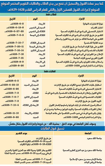 أعلنت عمادة شؤون القبول والتسجيل بجامعة الملك سعود الجدول الزمني لإجراءات القبول للطلاب والطالبات للعام الدراسي 1428-1429هـ، كما أكدت حدوث تعديل على إجراءات القبول لهذا العام، وذلك على النحو الآتي: