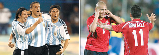 أما المنتخب الأرجنتيني المرشح الآخر للفوز بلقب البطولة على استاد ماراكايبو في 15 تموز - يوليو فقد بدأ البطولة بشكل جيد عندما حول تخلفه بهدف مبكر أمام نظيره الأمريكي إلى فوز ساحق 4 - 1 . ويخوض ألفيو باسيلي المدير الفني للمنتخب الأرجنتيني البطولة الحالية بأفضل نجومه مثل المهاجم الشاب ليونيل ميسي وخوان رومان ريكيلمي وهيرنان كريسبو. كما أظهرت نتائج الجولة الأولى بزوغ منتخبي باراجواي وبيرو كمرشحين للمنافسة على اللقب، حيث نجح منتخب باراجواي بفضل الأهداف الثلاثة التي سجلها روكي سانتا كروز مهاجم بايرن ميونيخ الألماني في التغلب على كولومبيا بخمسة أهداف نظيفة. أما منتخب بيرو فقد فجر مفاجأة كبيرة بالتغلب على منتخب أوروجواي بثلاثة أهداف نظيفة في الوقت الذي عانى فيه منتخب شيلي الأمرين حتى تغلب على إكوادور 3 - 2 . وأكد المنتخب الفنزويلي أن مستواه شهد تطوراً ملحوظاً في الآونة الأخيرة وأنه لم يعد أضعف الفرق في قارة أمريكا الجنوبية رغم أن بلاده هي الوحيدة من بين جميع دول قارة أمريكا الجنوبية التي تأتي فيها كرة القدم في المرتبة الثالثة من حيث الشعبية بعد البيسبول وكرة السلة. وتسعى فنزويلا إلى تدعيم هذا التطور في مستوى المنتخب على أمل زيادة أعداد المشجعين في المدرجات خلال مباريات هذه البطولة. ورغم ذلك تعادل المنتخب البوليفي 2 - 2 مع نظيره الفنزويلي قبل نهاية المباراة بسبع دقائق فقط.