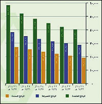 أما بالنسبة إلى مؤشر نسبة العمالة الوطنية لإجمالي العمالة في الصناعة، فيعد أيضاً من المؤشرات ذات الأهمية المتزايدة على صعيد الاقتصاد السعودي، ويظهر الشكل (3) النسبة المئوية للعمالة الوطنية من إجمالي العمالة في القطاعات الصناعية الرئيسة للعامين 2004-2005م، حيث يلاحظ من معدلات عام 2005م أن قطاع المنتجات الكيميائية يتصدر القطاعات الصناعية الأخرى بنسبة عمالة وطنية تبلغ 36.5%، يليه قطاع المنتجات الهندسية بنسبة تبلغ 24%، فقطاع مواد البناء بنسبة 22.6%، وأخيراً يأتي قطاع المنتجات الاستهلاكية بنسبة تبلغ 19.3%. وتبقى نسب العمالة الوطنية هذه متواضعة، إذ إن العمالة الأجنبية ما زالت تشكل الجزء الأكبر من مجموع القوى العاملة في القطاع الصناعي. ولكنه وعلى الرغم من النسب المتواضعة للعمالة الوطنية في القطاعات الصناعية المختلفة، إلا أن نسب العمالة الوطنية كما يتضح من الشكل (3) تظهر تزايداً مضطرداً في السنوات الأخيرة. ويعكس هذا الاتجاه نجاح المجهودات التي يبذلها القطاع الخاص في هذا المجال وتعاونه المستمر مع الدولة على تحقيق أهداف زيادة توظيف العمالة الوطنية في القطاع الصناعي.