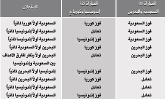 بعد نتائج الجولتين الأولى والثانية في المجموعة الآسيوية الرابعة التي تضم منتخبنا الوطني ومنتخبات البحرين وكوريا إضافة لإندونيسيا المستضيف أصبحت احتمالات تأهل المنتخبات الأربعة شبه متوازنة لتأهل أي منها إلى الدور الثاني، وأصبح كل منتخب من المنتخبات الأربعة مؤهلاً لأن يتأهل إلى الدور الثاني من البطولة وإن كانت حظوظ منتخبنا قوية في التأهل قياساً بالمنتخبات الأخرى حيث إن فرص المنتخب السعودي في التأهل متوفرة حتى وإن خسر - لا سمح الله - في بعض الحالات والتي على ضوئها ستخدمه نتيجة المباراة الثانية.