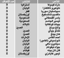 سعد الحارثي وأحمد الموسى وعبدالرحمن القحطاني (السعودية) وايلي ايبوي (إندونيسيا) ويونس محمود ونشأت أكرم وهوار ملا محمد ومهدي كريم (العراق) و(سوتي سوكسومكيت (تايلاند) وبدر الميمني (عمان) وتيم كاهيل ومايكل بوشان وهاري كيويل (استراليا) وهيونه ثانه ولي كونغ فينه (فيتنام) وبودي سودار سونو وبامبانغ بامونغكاس (إندونيسيا) ومحمود جلال وسلمان عيسى و(اسماعيل حسن (البحرين) وماو جيان بينغ (الصين) وايندرا بوترا (ماليزيا) وسيد جلال حسيني وجواد كاظميان وفريدون زاندي واندرانيك تيموريان (ايران) وتشوي سونغ كوك وكيم دو هيون وكيم جونغ وو (كوريا الجنوبية) والكسندر غينريخ واولو غبيك باكايف وعزيز ايبراغيموف (اوزبكستان) وفيصل خليل (الإمارات) وياسوهيتو ايندو اليابان. خطأ في مرماه: الإيراني حسن رضائي (لصالح اوزبكستان) - والياباني ياسوهيتو ايندو (لصالح فيتنام).