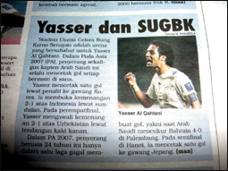 امتدحت صحيفة جاكرتا سبورت الإندونيسية لاعب المنتخب السعودي وقائده المهاجم الهداف، وأفردت مساحة كبيرة للحديث عن اللاعب والدور الكبير الذي لعبه مع زملائه اللاعبين حتى استطاع المنتخب السعودي التأهل إلى المباراة النهائية على كأس الأمم الآسيوية التي سيواجه فيها المنتخب العراقي الشقيق يوم الأحد المقبل، في العاصمة الإندونيسية جاكرتا .. وأطلقت الصحيفة على اللاعب ياسر القحطاني لقب ابن إندونيسيا، وقالت في الخبر الذي نشرته عنه أمس إن الجميع يتفق على أن ياسر ابن إندونيسيا بعد أن ارتبطت نجاحات هذا المنتخب الشاب بقيادة قائده الرائع والنجم الكبير ياسر القحطاني بالعاصمة جاكرتا.