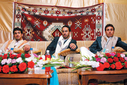 صلاح علي عبدالله صالح (يمين) وشقيقه خالد يتوسطهما ابن عمهما كنان يحيى محمد خلال زواج لهم في العاصمة اليمنية صنعاء مساء أمس الأول الاثنين*رويترز