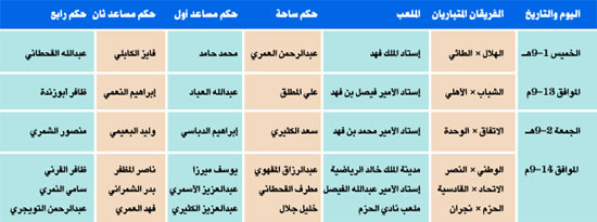 أعلنت لجنة الحكام الرئيسية بالاتحاد السعودي لكرة القدم عن أسماء الحكام المكلفين بإدارة لقاء الأسبوع الثالث من مسابقة الدوري السعودي لفرق الدرجة الممتازة وذلك على النحو التالي: