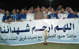 تنطلق مساء اليوم الخميس أولى مباريات دورة شهداء الواجب الثانية على أرض ملاعب الرويضان بمدينة بريدة وذلك في الساعة العاشرة مساء. ويجمع هذا اللقاء في مباراته الأولى عنيزة والأسياح والثانية البكيرية والقوة وتستمر هذه الدورة حتى منتصف شهر رمضان وقد حظيت هذه الدورة باهتمام وحرص من قبل المسؤولين وعلى رأسهم صاحب السمو الملكي الأمير الدكتور فيصل بن مشعل بن سعود بن عبدالعزيز نائب أمير منطقة القصيم من خلال مواقف سموه وتوجيه الدوائر ذات الاختصاص بالاهتمام وتسهيل كافة الإجراءات الكفيلة بنجاح هذه الدورة. وهذا ينطلق من اهتمام القيادة بهذه الفئة الغالية على قلوب الجميع وكذلك الدور الإيجابي من قبل القائمين على رعاية الشباب بمنطقة القصيم والقطاع الخاص، حيث تم دعم الدورة من قبل شركة المراعي ولوزين بـ100 تذكرة عمرة ذهاباً وأياباً مع إقامة بمكة المكرمة لأسر شهداء الواجب وذلك استشعاراً لمسؤولياته في خدمة المجتمع وكذلك توزيع منتجات المراعي ولوزين على الحضور طوال مدة الدور.
