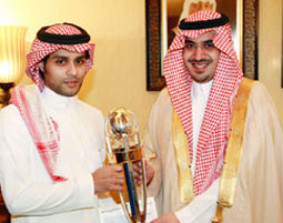 كرَّم صاحب السمو الملكي الأمير نواف بن فيصل بن فهد بن عبدالعزيز نائب الرئيس العام لرعاية الشباب نائب رئيس الاتحاد العربي السعودي لكرة القدم رئيس لجنة المنتخبات أمس كابتن المنتخب السعودي الأول لكرة القدم اللاعب الدولي ياسر القحطاني بمناسبة حصوله على لقب أفضل لاعب آسيوي لعام 2007م. |