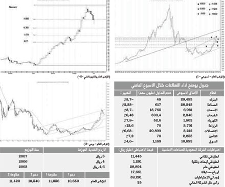بالنظر للرسم البياني على الفاصل اليومي للمؤشر العام نجد أنه بعد أن كسر الحاجز العلوي للمسار الذي يمثل مقاومة له لم يستطع الثبات أعلى من هذا المستوى فعاد المؤشر بعد أن أغلق أدنى منها لمحاولة العودة لها وعند عدم قدرته كسرها والثبات فوق هذا الحاجز تسارعت وتيرة الانخفاض في السوق حتى عاد لملامسة مناطق الدعم له والتي ارتد منها في نهاية تداولات الأسبوع الماضي ومن خلال النظر لمناطق الدعم والمقاومة للمؤشر العام نجد أنه مرشح في حال عدم استطاعته مع بداية تداولات هذا اليوم أن يثبت أعلى من مستوى 11.056 نقطة أن يعود لزيارة مناطق الدعم الأفقية له التي تسبق مستوى دعم المسار الصاعد ويقع أولها عند مستوى 10.805 نقطة التي بكسرها يكون المؤشر العام مرشح لزيارة مستوى الدعم الأفقي الثاني عند مستوى 10.630 نقطة ويلي هذا المستوى مستوى دعم المسار الصاعد للسوق عند مستوى 10.410 نقاط وبالنظر إلى المؤشرات الفنية نجد أنها وفي حال استطاع المؤشر الإغلاق مطلع تداولات هذا الأسبوع أعلى من 11.056 فمن المتوقع أن يستهدف المؤشر مستوى مقاومته الأولى عند النقطة 11.210 نقاط ويليه المستوى الثاني عند 11.350 نقطة وهو الذي بالثبات أعلى منه يجعل المؤشر بمساره لاستهداف مستويات المقاومة الأسبوعية، والجدير بالذكر أن المؤشر العام استطاع في موجة جني الأرباح الماضية أن يغلق أدنى من مستوى المتوسط المتحرك 10 أيام عند النقطة 11.220 نقطة ويعتبر المتداولون النشطون أن الإغلاق أدنى من هذا المستوى بمثابة إشارة التمهل عن عمليات البيع والشراء لحين عودة المؤشر أعلى من مستوى هذا المتوسط المتحرك أما المستثمرون على المدى الأبعد المتوسط والطويل فهم ينظرون إلى مستوى المتوسط المتحرك 50 يوما عند مستوى 9.676 نقطة وتعتبر التداولات أعلى من هذا المتوسط بمثابة الإشارة إلى استمرار وتيرة التداولات المنتظمة، وقد يكون جني الأرباح الذي تعرض له السوق إيجابياً من حيث تقليص الفارق بين مسيرة المؤشر العام وبين تحركات متوسطاته حيث إنها تشكل مستويات دعم للمؤشر العام.