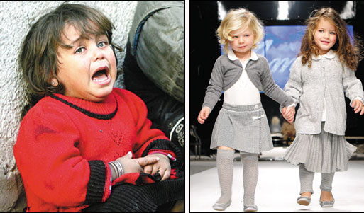 لقطتان لا تحتاجان لتعليق والفرق بينهما واضح وممتد بين دموع طفلة فلسطينية خلال تشييع لجنازة جمعة محمد علي في مخيم للاجئين بجباليا وبين طفلتين تبدوان سعيدتين خلال عرض لأزياء الشتاء في إيطاليا .