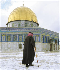 مسن فلسطيني أمام قبة الصخرة في القدس القديمة وسط الثلوج التي غطت باحات المسجد الأقصى بعد العاصفة الثلجية التي غطت أجزاء واسعة من دول الشرق الأوسط. |