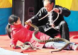 فتاة صينية ومعها مدرب تستعرض باللعب مع أفاعي سامة في مهرجان الصين القمري في بكين ] أ.ف.ب