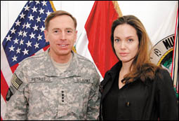 الممثلة الأمريكية أنجلينا جولي زارت العراق بصفتها سفيرة للنوايا الحسنة والتقت بالجنرال ديفيد بيتريوس وعدد من قادة القوات المتعددة الجنسيات هناك واطلعت على الوضع الإنساني للعراقيين |
