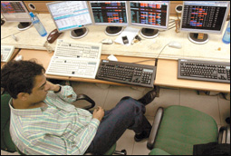 هوى مؤشر سينسكس القياسي للأسهم الهندية بنسبة 5.64 بالمائة خلال التعاملات المبكرة أمس الاثنين في ظل ضعف المؤشرات بشأن الاقتصاد العالمي، ويبدو في الصورة أحد المتعاملين أمام شاشات البورصة الهندية نائماً للابتعاد عن هموم السوق مؤقتاً. ] ( أ.ف.ب)