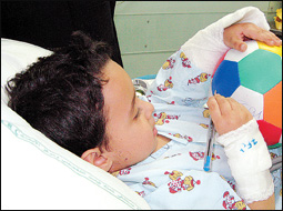 بأنامل تكتسيها رعشة الحزن يقوم الطفل أحمد بن عبد الرحمن الزهراني بكتابة أسماء أفراد أسرته من على السرير الأبيض متذكراً والدته وشقيقته اللتين كانتا ضحية للارهاب. > تصوير- محمد الشهري |