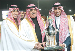 توج سمو ولي العهد - حفظه الله - الخيال المتمرن فهد المزيني والمالك أحمد بن محمد الطيار بكأس وهدية الملك للخيالة السعوديين المتمرنين بعد نهاية الشوط السادس مساء البارحة بميدان الملك عبدالعزيز بالجنادرية بعد الدخول القوي لبنت لزوم نهلا تحت الخيال فهد المزيني وعلى حساب المتصدرة لمى الرياض في المراحل الأخيرة ...>>>... |