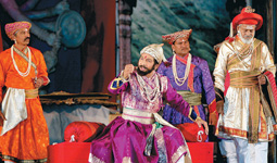 شارك أكثر من 200 فنان تساندهم خيول وفيلة في عرض ملحمة تاريخية مسرحية عنوانها (جاناتا راجا) عن سيرة الماهاراشترا براكاشان على مسرح الفنون في أحمد أباد ] (أ. ف. ب) |
