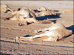 وأكد المواطن أبو سلطان أن (5) من إبله الآن مصابة بهذا المرض الذي قضى على الأعداد السابقة, وأضاف أنه أحضر طبيبين بيطريين من الزراعة وتم أخذ عينة من دم الإبل النافقة وجلودها ولحومها والأعلاف المقدمة لها للتأكد من سبب هذا النفوق الذي حل فجأة بالإبل.