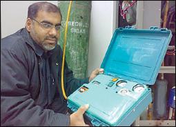 نجح مخترع سعودي في ابتكار جهاز جديد يسهم في تخفيض ساعات العمل وتقليل الأيدي العاملة في عمل صيانة أجهزة التكييف بنسبة كبيرة. وعكف (حسن بن إبراهيم امسيري) حوالي 6 أشهر على تصميم اختراعه حتى تم تقديمه إلى مدينة الملك عبدالعزيز للعلوم والتقنية؛ للحصول على براءة اختراع. ويشرح امسيري الاخترع قائلاً: بدأ التفكير في عمل هذا الاختراع بالتحديد في شهر يوليو 2007م عندما كان هناك ضغط في العمل بسبب كثرة الأعطال في وحدات التكييف، ناهيك عن قلة الكوادر الفنية, حيث كانت تأخذ عملية تعبئة غاز الفريون بوحدات التكييف وقتاً طويلاً؛ لذا جاءت فكرة عمل الاختراع ليصبح جهازاً سهل الاستخدام وفاعلاً في إنجاز العمل في تعبئة المكيفات بغاز الفريون آلياً بعدد كاف من الفنيين مع تقليل التكاليف كذلك. ويتمثل عمل الجهاز كما يقول (امسيري) في نظرية الضغط، وهي مستخدمة كثيراً عند الفنيين, (حيث قمت برسم الدائرة الميكانيكية والكهربائية للجهاز، وعند التوصل إلى الطريقة النظرية الكاملة بدأت بتجميع القطع للجهاز, وبعدها قمت بالتجارب عند الضغوط المنخفضة فنجح الجهاز، وبتجربته على وحدات التكييف فشل الجهاز بسبب زيادة الضغط فقمت بتغيير الجهاز، وذلك بتغيير وإضافة بعض القطع التي تناسب الضغوط المستخدمة بتغيير كل من الدائرة الميكانيكية والكهربائية للجهاز, وفي التجربة الثالثة نجح الجهاز في العمل في ضغوط تصل إلى 40 بار). وعن مواصفاته ذكر (امسيري) أنه عبارة عن جهاز يتحكم في ضغوط تصل إلى (40 bar - 580.151 PSI,خفيف الوزن (15 Kg) وطاقة (110 - 220 V - 0.8 - 0.4 A - 60 HZ), صغير الحجم (31 Cm ? 28 ? (15. وعن إمكانية استخدامه في أمور صناعية أخرى قال: سوف أسعى إلى تطويره حتى يمكن استخدامه في ورش السيارات لصيانة التكييف وكذلك بناشر السيارات حيث تتم تعبئة إطارات السيارات إلى الضغط المراد آلياً دون التحكم يدوياً.وبيّن (امسيري) أن الاختراع سيحل مشكلة صرف الوقت المهدر في عملية تعبئة غاز الفريون، بالإضافة إلى تقليل عدد العمالة أيضاً. وأشار إلى أن تسجيل هذا الاختراع في مدينة الملك عبدالعزيز يعتبر فتحاً جديداً في أنظمة صيانة التكييف وتغيير مساراتها. وتوقع أحد المتعاملين في مجال التكييف أن يسجل هذا الاختراع حضوراً قوياً إذا ما ثبت نجاحه عملياً؛ إذ ستستفيد منه كثير من شركات الصيانة، وخصوصاً في فترة الصيف التي تعد من أكبر الفترات استخداماً وتكثر الأعطال بها. وأضاف أنه على استعداد للمشاركة في إنجاح هذا الاختراع ودعمه وتطويره.