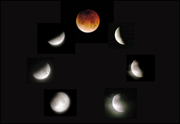 صورة مجموعة من سبع صور تظهر مراحل مختلفة من الكسوف القمري من الجزئي إلى الكلي الذي تابعه العالم باهتمام أمس |