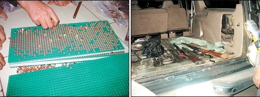 تمكن رجال جمارك الحديثة من إحباط محاولة تهريب أسلحة متنوعة للأراضي السعودية وقال مدير عام جمرك الحديثة زايد بن عطا الله الزايد إنه وبفضل من الله ثم بفراسة رجال الجمارك وبفضل ما أدخلته الجمارك السعودية من تقنية حديثة ومتطورة تساعد على كشف جميع أنواع المهربات تم مؤخراً إحباط محاولة تهريب كمية من الأسلحة المتنوعة، التي تتمثل بالرشاشات والأعيرة النارية والمسدسات والبارود مخبأة في إحدى السيارات الخاصة حيث تم ضبط: رشاش ناري واحد، وبندقيتين (شوزن)، و(6) مسدسات، و(2310) طلقات (مسدس 9 ملم)، و(18) مخزن مسدس، و(7000) كبسولة إطلاق شوزن، و(650) طلقة شوزن، و(100) طلقة مسدس (عيار سبعة ملم)، ومكبسي ذخيرة مسدس، و(20) كيلو خردل رصاص، وكيلو ونصف الكيلو من ملح بارود.