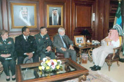 استقبل صاحب السمو الملكي الأمير خالد بن سلطان بن عبدالعزيز مساعد وزير الدفاع والطيران والمفتش العام للشئون العسكرية بمكتبه في المعذر أمس وكيل وزارة الجيش الأمريكي - نيلسون فورد والوفد المرافق. وقد جرى أثناء اللقاء تبادل الأحاديث الودية ومناقشة عدد من المواضيع ذات الاهتمام المشترك. وفي نهاية اللقاء تسلم سموه هدية تذكارية بهذه المناسبة من وكيل وزارة الجيش الأمريكي. حضر اللقاء رئيس بعثة التدريب العسكرية الأمريكية اللواء ريت هرنانديدز. كما استقبل سموه بمكتبه في المعذر بالرياض أمس معالي رئيس هيئة أركان القوات المسلحة الفرنسية الفريق أول جان لوي جيور جولان والوفد المرافق له. وجرى أثناء اللقاء تبادل الأحاديث الودية ومناقشة عدد من المواضيع ذات الاهتمام المشترك. حضر اللقاء الملحق العسكري السعودي لدى فرنسا اللواء الطيار الركن عبدالله السحيباني.