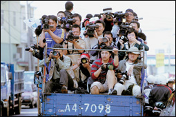مجموعة من مصوري الصحف والوكالات والتلفزيونات في تايوان (محشورون) في صندوق شاحنة للحزب القومي أثناء فترة الانتخابات الرئاسية في دالي..* (رويترز) |