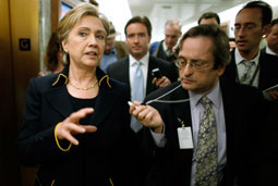 فقد اتبعت سلوك رجال الدولة بدون انفعالات، لكن صوتها كان ينم عن ازدراء بتأكيدات إدارة الرئيس الأميركي جورج بوش بأن إستراتيجية زيادة عديد القوات الأميركية في العراق حققت نجاحاً. ويتقدم كل سناتور على الآخرين في أولوية الاستجواب استناداً إلى مدة وجوده في الكونغرس.