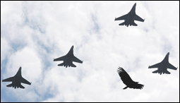 طائر يشارك طائرات مقاتلة في سماء عاصمة فنزويلا في احتفال ذكرى عودة شافيز