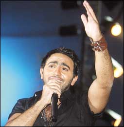 المغني المصري تامر حسني يغني في ملعب بالجزائر وسط حضور جماهيري وصف بالغفير وفي الصورتين معجبات يلوحن بأيديهن مع أغاني تامر وآخر يلتقط صورة تذكارية معه |