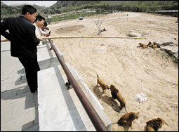 زوار صينيون خلال زيارتهم لحديقة حيوان مفتوحة في بدالينق، وهم يرمون سنارات معلق بها دجاج كي تصطاده الأسود القابعة أسفل الجسر، وهي خدمة تقدمها إدارة الحديقة لزوارها. ] رويترز |