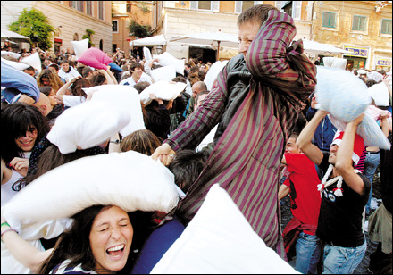 مواطنون إيطاليون يتمازحون في مهرجان ضخم لوسادات النوم بسانتا ماريا، حيث خرجوا يوم الأحد بالمئات (رويترز) |
