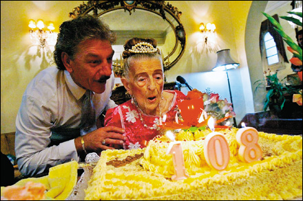 احتفلت العجوز ماري بذكرى ميلادها الـ 108 حيث تظهر في الصورة الأولى وهي تطفئ الشموع متزينة باللباس الأحمر الحرير.. وفي الصورة الثانية عاملة الكوفير تضع لها أحمر شفاه ] رويترز |